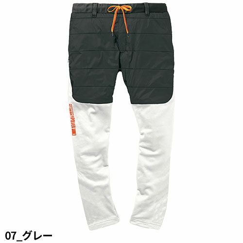 ウエスト総ゴム仕様、フロントファスナー、ドローストリング、ベルトループ、右脚ファスナーポケット、右脚プリント、左脚反射パイピング