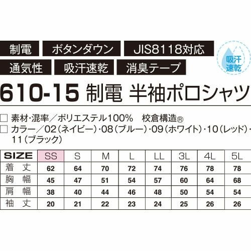 他の画像を見る 作業服 ポロシャツ 半袖 アタックベース ATACK BASE 制電半袖ポロシャツ 610-15 作業着 春夏 特別価格 ¥ 2,024 税込 制電×通気性導電繊維入り素材使用で高い機能性を実現した、JIS T8118 静電気帯電防止ポロシャツ 通気性が良く、ベトツキを軽減する校倉編み生地「shikibo校倉構造」を使用「高通気度」と「機能性素材」の組み合わせのボタンダウンポロ清潔感ある襟元に細身のシルエットで、見た目も好印象の制電ポロシャツです 詳細を見る お気に入りに登録する