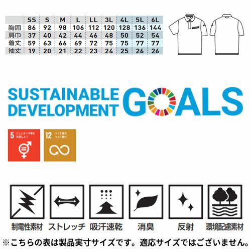 衿元のボタンダウンがフォーマルなムードを演出するSDGsに対応したエコロジカルなポロシャツ ・ペットボトルリサイクル100%の日本製TEIJINエコトリコット素材を採用・エコロジカルポロシャツは1枚につき500mlペットボトルを約8本使用・吸汗速乾、UVカット、ストレッチを特性とする高機能トリコット素材・優れた帯電防止性を備えるJIS T8118適合プロダクト・フォーマルなビジネスシーンに適応するボタンダウン仕様・不快な汗のニオイを抑える消臭テープ付き・男女ユニセックスの着用に対応