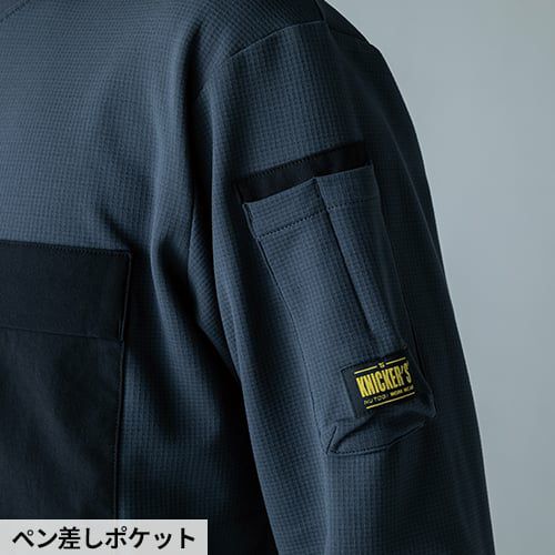 肉厚ストレッチ生地を使用したハードワーク対応ウエア ・肌触りが良く吸湿性のある綿高混率素材・肉厚で丈夫なヘビーウエイトTシャツ・ポリウレタン混で抜群のストレッチ性・袖ペン差し付き・不快なニオイを軽減するデオドラントテープ付き