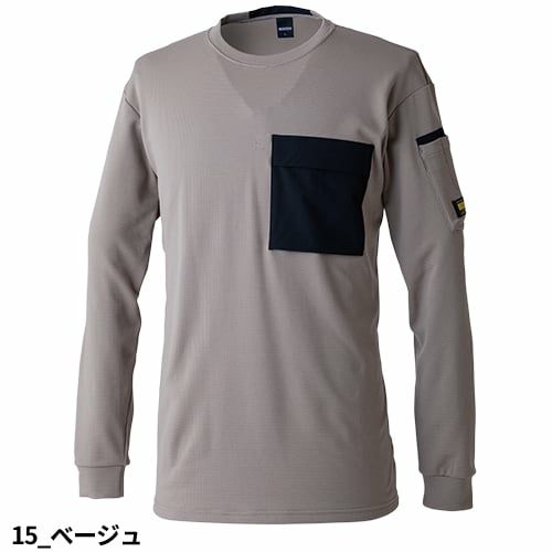 新ドライ素材の使用現場仕様の蒸れにくいワッフルハーフジップ ■ドライワッフル繊維の中で最も軽くて保水しない素材であるPP(ポリプロピレン)を肌側に使用することによって、汗をかいても蒸れにくくベタつかない。断熱性と速乾性にも優れており、快適に着用し続ける事が出来る。