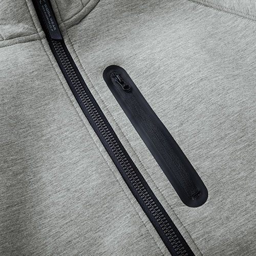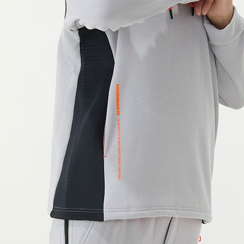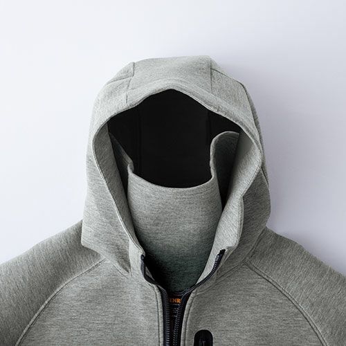 飽きのこないシンプルデザインのフーディは首元にうれしいギミックを搭載 生地断面の段ボール構造内、中空部分に暖かい空気の層を作ることで薄くても快適な保温性を確保軽量でストレッチ性の高い人気のダブルニット素材に、首元からネックウォーマーを引き出せる機能を搭載気温の変化に応じてネットウォーマーをオン・オフでき1枚で2タイプの着こなしが可能になっています。