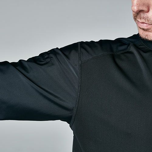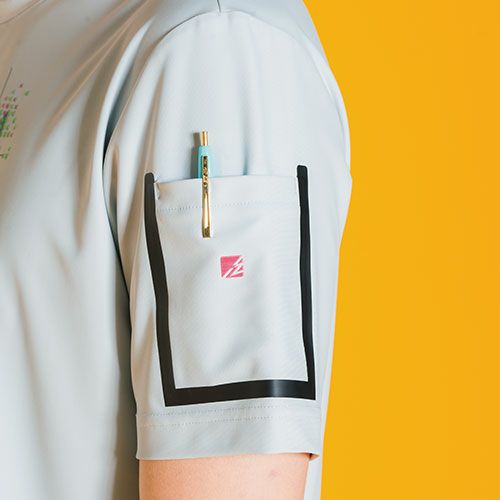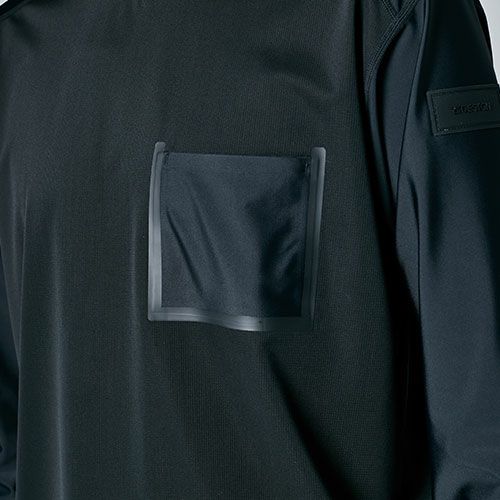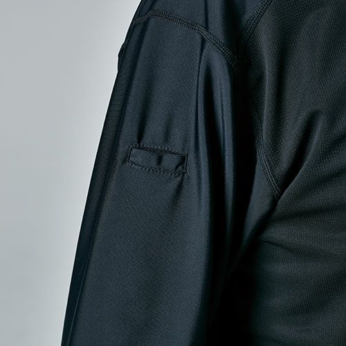 夏場に最適なさらっとした肌触りと接触冷感フィールを肌面が冷感ナイロンのダブルフェイスニットが可能にしたシャープシルエットのサマーニットシリーズ 吸汗速乾、放湿性、接触冷感に優れる二重編み素材ドライタッチ素材と消臭テープ仕様で不快感を軽減ジャストサイズなポケットを胸と左袖に配置