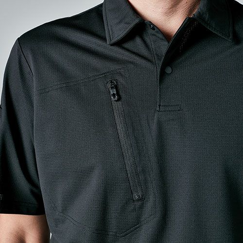 ワークシーンだけでなくスポーツウェアや普段着としても活躍する、オールラウンダーな冷感ポロシャツ ●高級感漂う綿ライクなルックスに、快適性と機能性もあわせもつダブルフェイスニットを使用しており、あらゆるシーンで着用できます●接触冷感機能付きで、着用するとひんやり涼しい●伸長率:ヨコ28.8%・タテ14.5%の高ストレッチで、動きやすく型崩れもにしくい●ダブルポケットなどワークシーンに役立つ便利な機能付き●前たてには光沢オリジナルボタンを採用するなど、細部までデザインにこだわっています●シンプルさと高級感を両立させるエレガントブラックカラー
