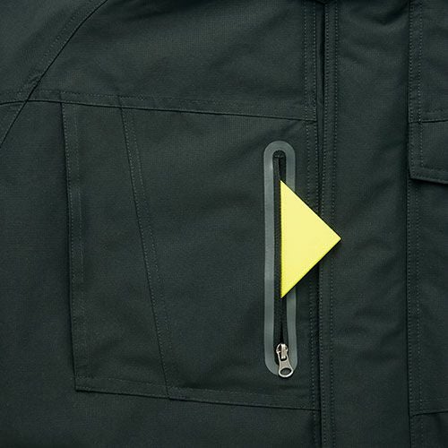 レフレクター(反射材)は、表面が濡れても輝度が変わることが少ない超高輝度マイクロプリズム反射素材(EN471認証品)を使用することにより、最前線で働く人の安全性を高めます。フードは立体設計でフィット感が高く、良好な視界が確保できます。
