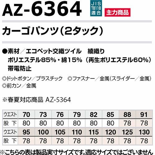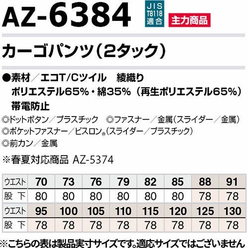 アイトス AZ-6384 カーゴパンツ(2タック ツータック) AITOZ 作業服 作業着 ポケット付き ボトムス 秋冬 通年 カーゴパンツ おしゃれ かっこいい 人気 ズボン 作業ズボン 作業パンツ 作業 工事 土木 塗装 DIY メンズ レディース 男女兼用 帯電防止