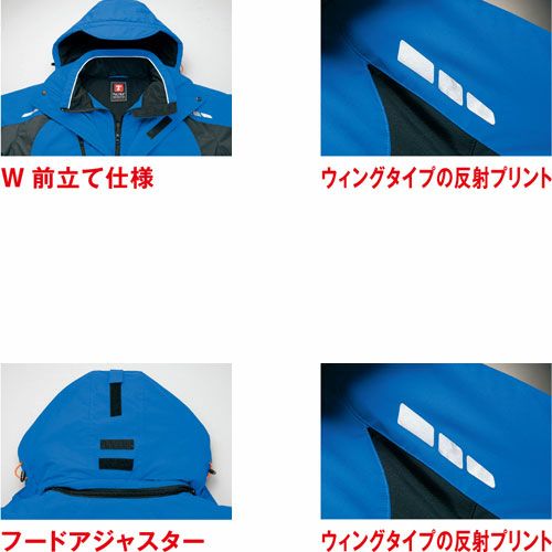 レフレクター(反射材)は、表面が濡れても輝度が変わることが少ない超高輝度マイクロプリズム反射素材(EN471認証品)を使用することにより、最前線で働く人の安全性を高めます。フードは立体設計でフィット感が高く、良好な視界が確保できます。