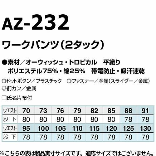 アイトス AZ-232 ワークパンツ(2タック ツータック) AITOZ 作業服 作業着 腿ポケット無 ボトムス スラックス パンツ ズボン メンズ レディース 男女兼用 春夏 ワークパンツ 帯電防止 吸汗 速乾