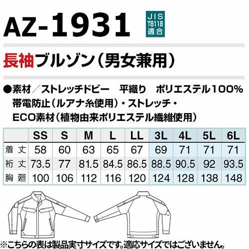 作業服 ブルゾン AITOZ アイトス 長袖ブルゾン(男女兼用) AZ-1931 作業着 春夏 会社 工場 店舗 運送 制服 カラー豊富 サイズ豊富 動きやすい 制電 UVカット 軽量 吸汗速乾 遮熱