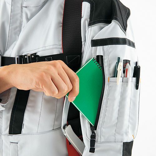 フルハーネス装着時も高い運動性を発揮するプロ仕様 3D立体裁断&ストレッチ素材で腕が動かしやすい数多くのポケットを活用できて収納力に優れているハーネスが触れる部分を磨耗耐久素材使用して強化