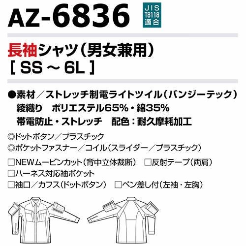 作業服 長袖シャツ AITOZ アイトス フルハーネス対応ムービンカット長袖シャツ 男女兼用 AZ-6836 作業着 春夏 帯電防止 動きやすい 反射材 ストレッチ シャツ 長袖 春夏 メンズ レディース ワークウェア