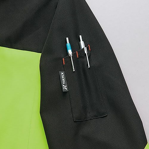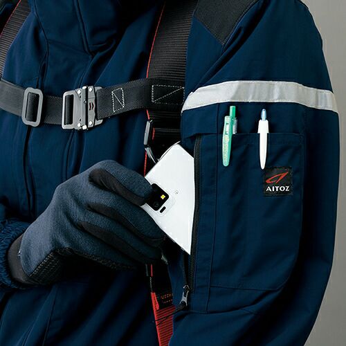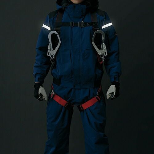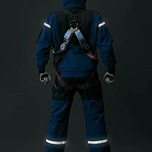 フルハーネス対応防寒防寒着の上からフルハーネス着用(目視での点検が可能)透湿・防水・制電生地仕様 ●表地、裏地、中綿に制電素材を使用しハーネス装着時に干渉する部分に補強素材を使用●衣服内の温度を調節できるベンチレーション機能、フルハーネス着用時にも使用可能な大型ポケット等、こだわりの仕様●耐水圧 10000mmH2O、透湿度 8000g/m2/24hrs
