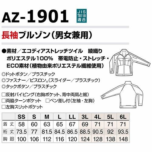 作業服 ブルゾン 長袖ブルゾン AZ-1901 作業着 ジャンパー ストレッチ 帯電防止 JIS規格対応 アイトス AITOZ おしゃれ かっこいい 人気 ワーク企業 法人 作業 工場 外作業 4L 5L 6L 秋冬 メンズ レディース 男女兼用 防寒着 防寒ジャケット