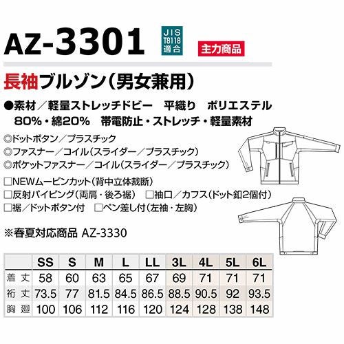作業服 ブルゾン 長袖ブルゾン AZ-3301 作業着 ジャンパー アイトス AITOZ ストレッチ 帯電防止 軽い 動きやすい おしゃれ かっこいい 作業 工場 外作業 大きいサイズ 4L 5L 6L 秋冬 メンズ レディース 男女兼用 防寒着 防寒ジャケット