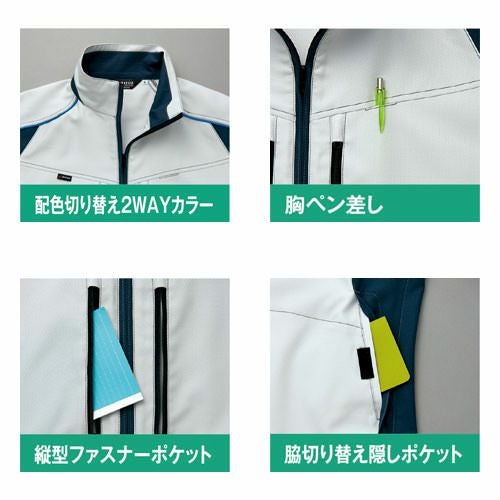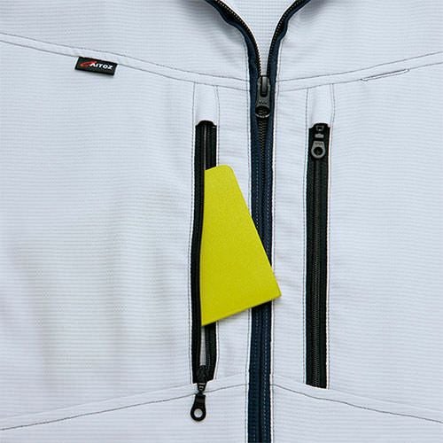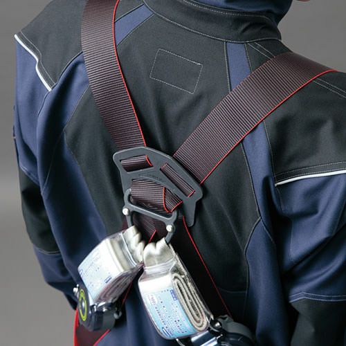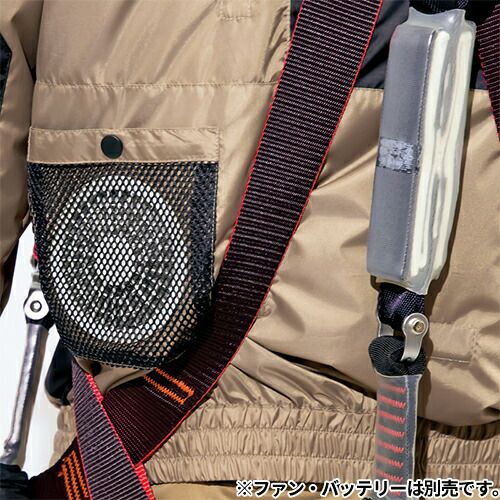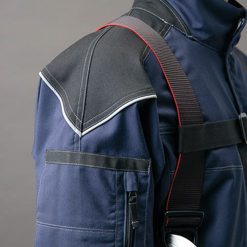 フルハーネスのベルトから影響の受けにくい位置を想定し、腕部分に大型のファスナーポケット・ウエスト中央側に取り出し口のあるファスナーポケットを配置。またスペーサーパッドを取り付けることにより、フルハーネス着用時も襟元までダイレクトに風を感じることができ、快適に使用することができます。