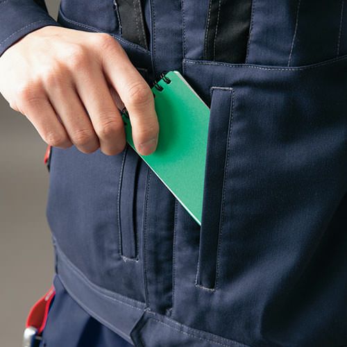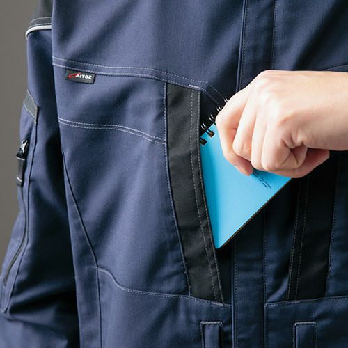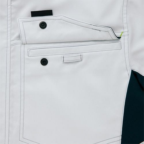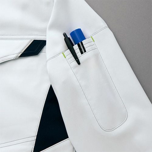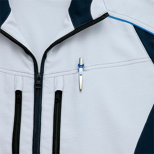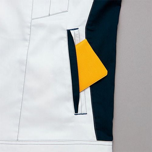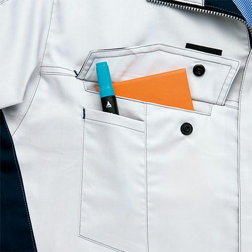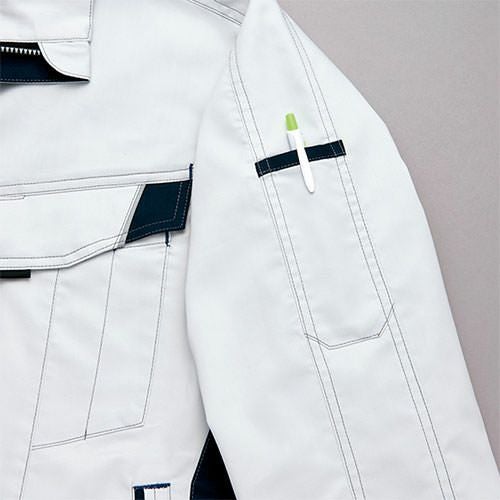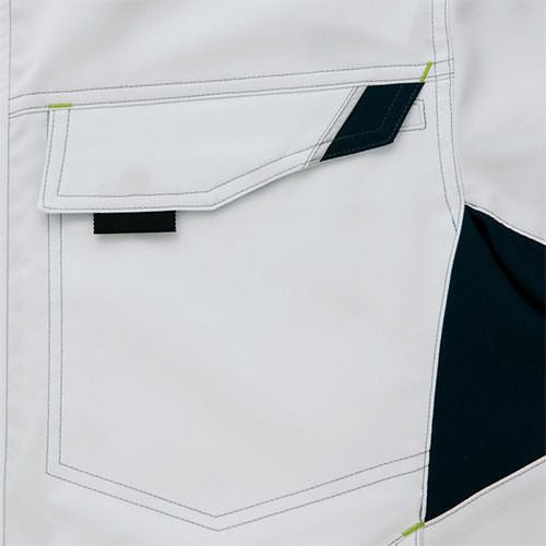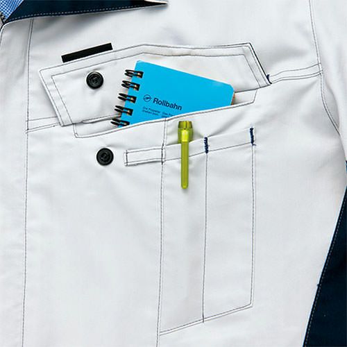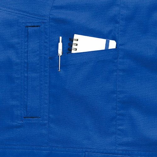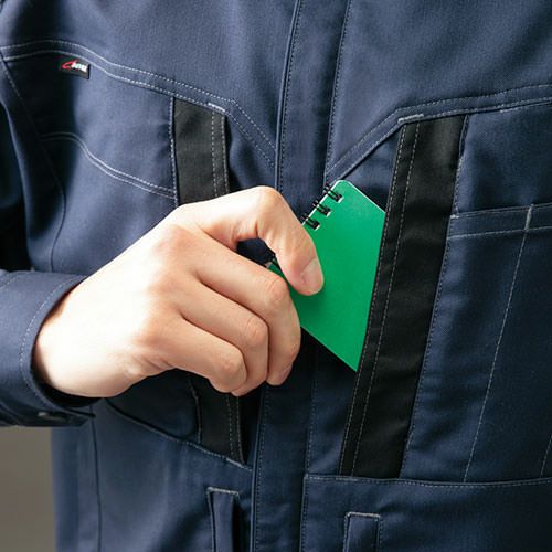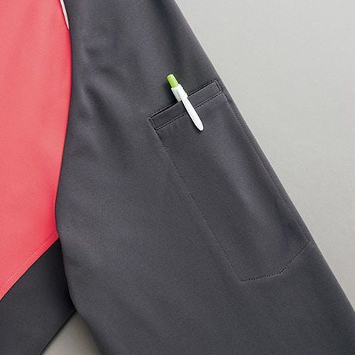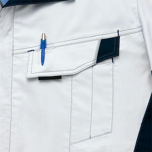 クラボウが共同開発した立体カッティング技術で、腕・肩部分に驚異的な動きやすさを提供。ポケットやペン差しも出し入れしやすいよう設計されております。