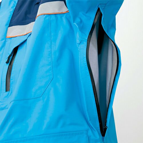 レフレクター(反射材)は、表面が濡れても輝度が変わることが少ない超高輝度マイクロプリズム反射素材(EN471認証品)を使用することにより、最前線で働く人の安全性を高めます。フードは立体設計でフィット感が高く、良好な視界が確保できます。