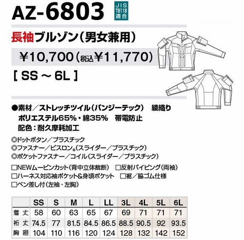 作業服 ブルゾン アイトス 長袖ブルゾン AZ-6803 作業着 通年 秋冬 フルハーネス対応 動きやすい 帯電防止 反射材 ストレッチ おしゃれ かっこいい 人気 作業 工場 外作業 4L 5L 6L 秋冬 メンズ レディース 男女兼用 防寒着 防寒ジャケット