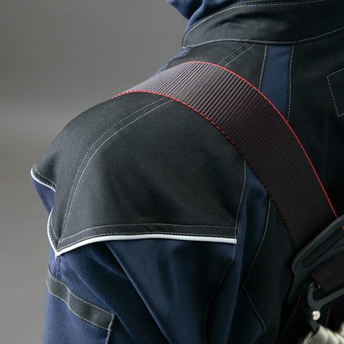 フルハーネス装着時も高い運動性を発揮するこだわりのプロ仕様 フルハーネスを装着しても●3D立体裁断&ストレッチ性素材で腕が動かしやすい●数多くのポケットを活用できて収納力に優れている●ハーネスが触れる部分を摩擦耐久素材を使用して強化