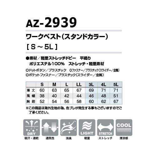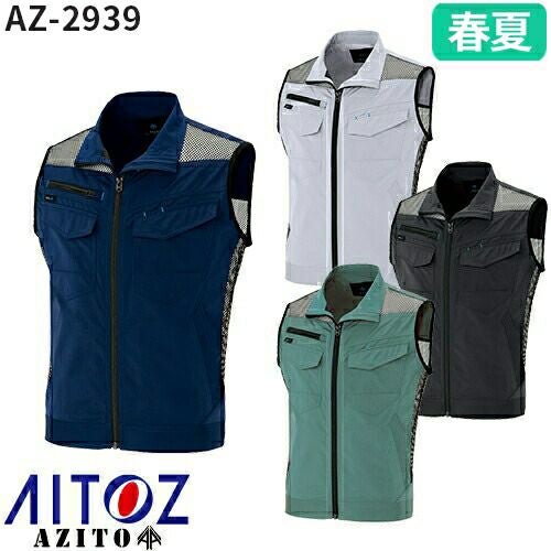 作業服 ベスト AITOZ アイトス ワークベスト(スタンドカラー) AZ-2939 作業着 春夏 アウター 春夏 メンズ レディース 男女兼用 ワークウェア 吸汗 速乾 通気性 消臭 軽量 ストレッチ