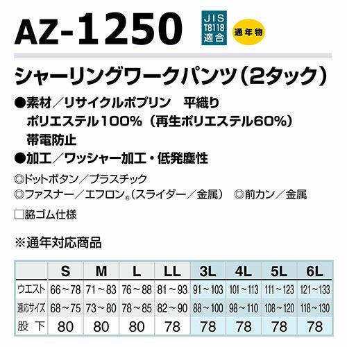 アイトス AZ-1250 シャーリングワークパンツ 2タック ツータック AITOZ 作業服 作業着 腿ポケット無 秋冬 通年 スラックス ワークパンツ ズボン おしゃれ かっこいい 作業 軽作業 外作業 工場 パンツ メンズ レディース 男女兼用 帯電防止