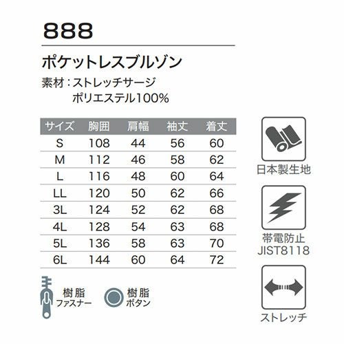 他の画像を見る 作業服 ブルゾン ジャケット 作業着 ジャンパー 制電 帯電防止 エコマーク対応 長袖 上着 ジャンバー Asahicho 旭蝶繊維 888 定番 シンプル おしゃれ かっこいい 人気 定番 ワーク企業 法人 作業 工場 外作業 大きいサイズ 3L 4L 5L 6L 特別価格 ¥ 4,830 税込 〜 特別価格 ¥ 税込 全てのポケットが無いから異物混入を防げる! 洗濯耐久性とストレッチ性を兼ね備えたポケットレスシリーズ 在庫切れ 詳細を見る お気に入りに登録する