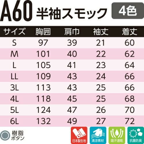 他の画像を見る 作業服 レディース 女性 Asahicho 旭蝶繊維 半袖スモック A60 作業着 春夏作業着 作業服 レディース 春夏 特別価格 ¥ 3,806 税込 〜 特別価格 ¥ 税込 帯電防止素材・吸汗速乾・抗菌防臭!高機能な快適半袖スモック!! 詳細を見る お気に入りに登録する