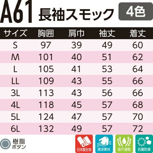 他の画像を見る 作業服 レディース 女性 Asahicho 旭蝶繊維 長袖スモック A61 作業着 春夏作業着 作業服 レディース 春夏 特別価格 ¥ 3,861 税込 〜 特別価格 ¥ 税込 帯電防止素材・吸汗速乾・抗菌防臭!高機能な快適長袖スモック!! 詳細を見る お気に入りに登録する