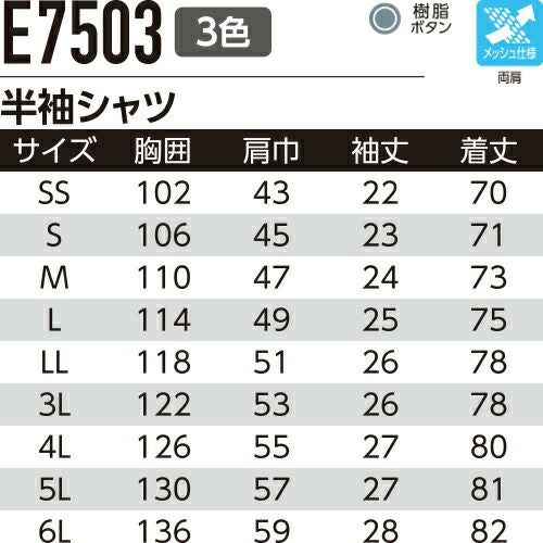 他の画像を見る 作業服 半袖シャツ Asahicho 旭蝶繊維 半袖シャツ E7303 作業着 春夏作業着 作業服 半袖 春夏 特別価格 ¥ 4,543 税込 〜 特別価格 ¥ 税込 機能満載!JIS帯電防止ワークウェアの決定版!! ヨコのびストレッチ・JIS帯電防止・防汚加工、耐久性と快適性を兼ね備えたワークウェア 詳細を見る お気に入りに登録する