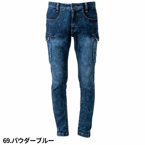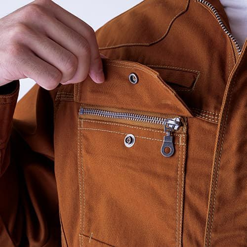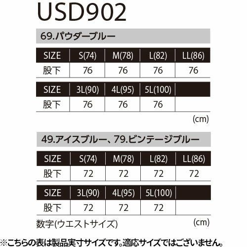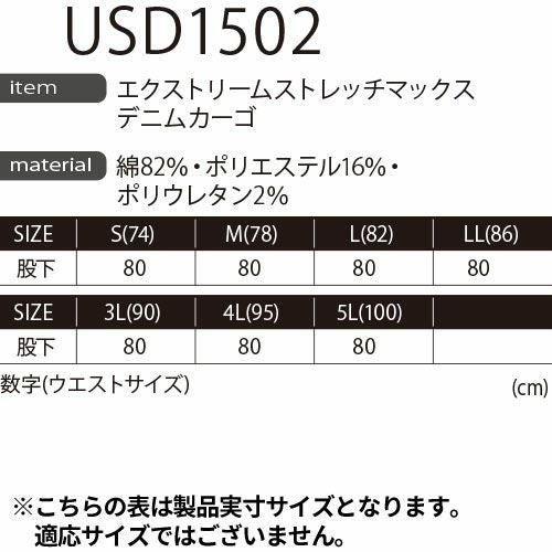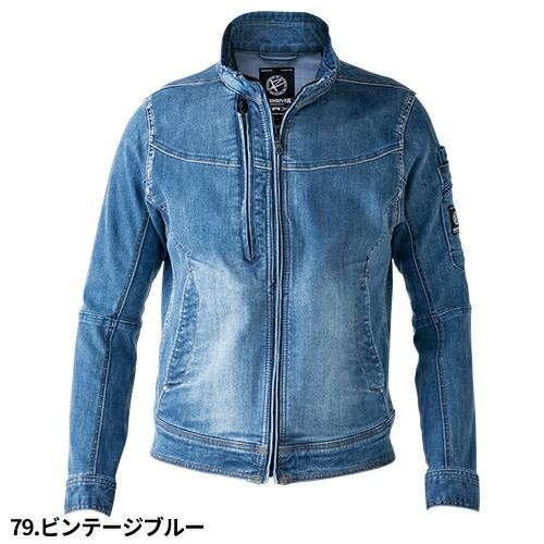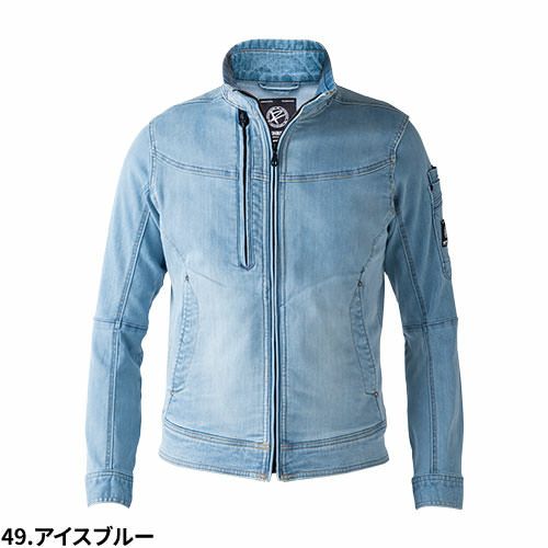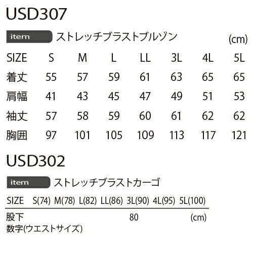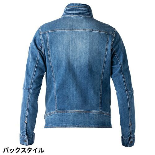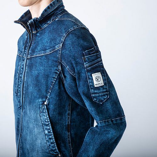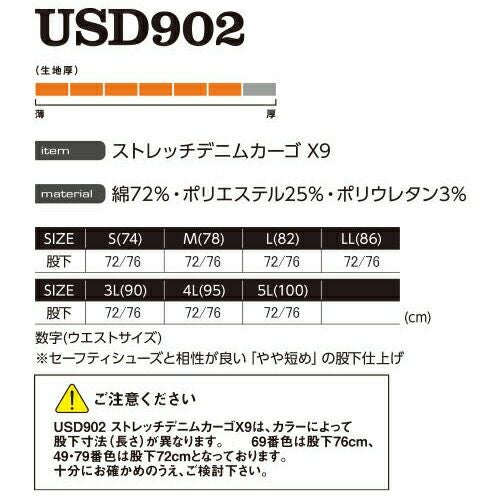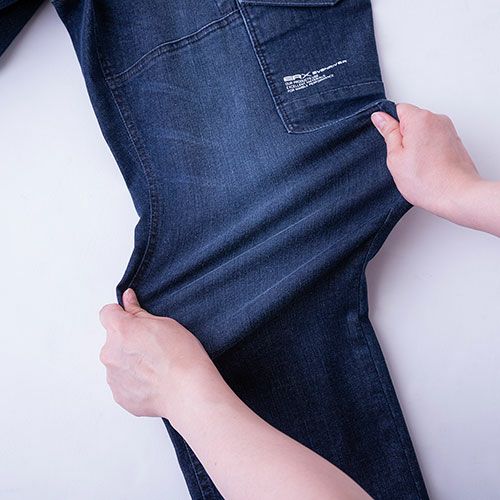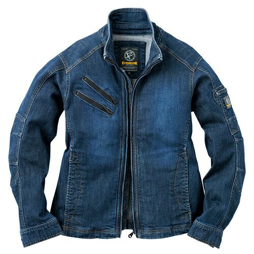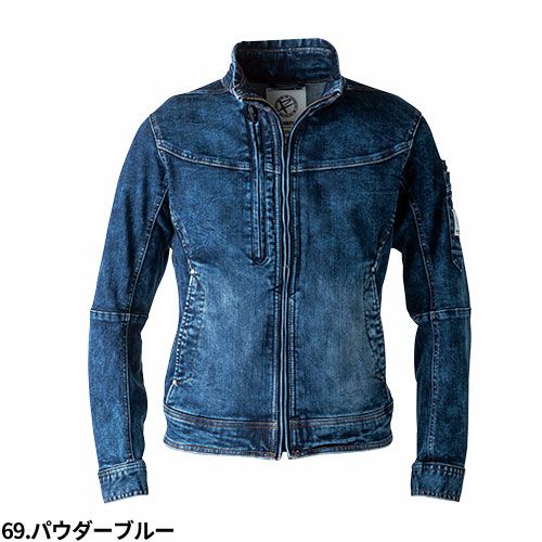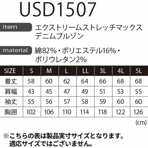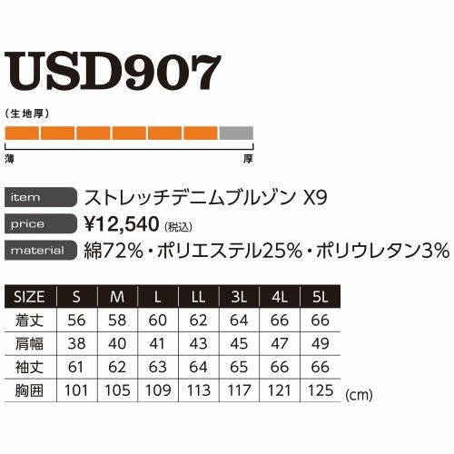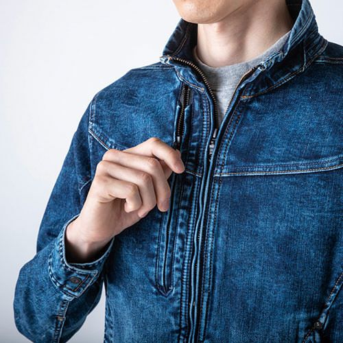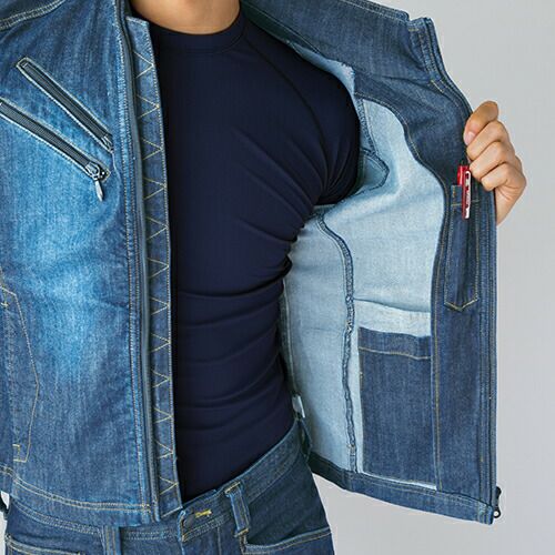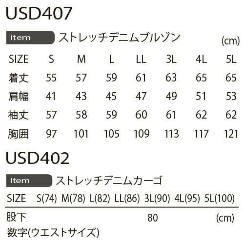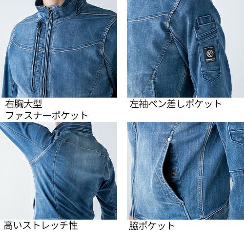 伸縮性能を強化したハイパワー糸使用ストレッチモデル 高機能のストレッチ糸を使用し、歴代USDストレッチデニムシリーズの中で最高レベルの伸縮率を実現。【ジャケット】右胸に配置された大容量大型ファスナーポケットで収納性が大幅にアップ。アーム廻りも程よいフィット感のすっきりシルエットに仕上げてあり、より洗練されたスタイリッシュシルエットへ。【パンツ】足回りがバタつかないスキニーフィットタイプながら、高い伸縮性・伸縮回復性で不快なつっぱり感や締め付け感を防止。セーフティシューズと相性が良い「やや短め」の股下仕上げ。