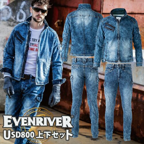作業服 デニム上下セットアップ イーブンリバー EVENRIVER 作業服 上下セット(長袖ブルゾンUSD807+カーゴパンツUSD802) 作業着 通年 秋冬作業着 作業服 デニム上下 通年 上着 ジャケット ブルゾン ズボン パンツ おしゃれ 作業
