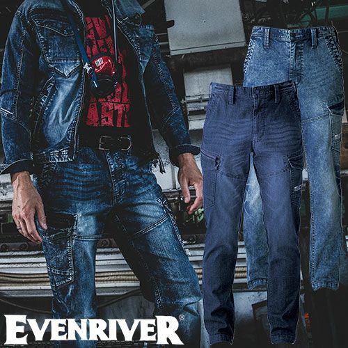 作業着 デニム 上下セット イーブンリバー EVENRIVER 作業服 綿100 耐久性 ジージャン ジーパン ジーンズ カーゴパンツ デニムジャケット SR-4007 デニムパンツ SR-4002 Gジャン セットアップ ブルゾン おしゃれ 人気 安い