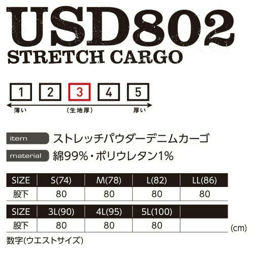 作業服 デニム イーブンリバー EVENRIVER ストレッチパウダーデニムカーゴ USD802 作業着 通年 秋冬作業着 作業服 デニムパンツ通年