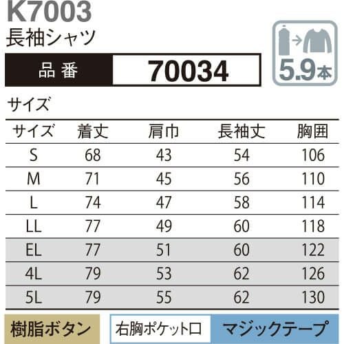 他の画像を見る 作業服 長袖シャツ 大川被服 kansai uniform カンサイユニフォーム K7003 70034 作業着 春夏 特別価格 ¥ 5,730 税込 〜 特別価格 ¥ 税込 接客において重要な、第一印象のために。 目は口ほどにものを言ういつも何気なしに着用しているユニフォームしかし、そのユニフォームはお客様へ物を言わないメッセージを発信しています誠意・礼儀・清潔・丁寧・感謝・努力・親しみ・その他多くの発信するメッセージが第一印象となりお客様に伝わりますそんな接客を伴う作業をされる皆様に向けて、開発をした商品です夏場の通気性や洗濯性はもちろんの事、嫌な臭いを抑えてくれる消臭テープを採用していますJIS-T-8118適合エコマーク認定のコンプリートモデルです(クラレトレーディング・日本製素材使用) 詳細を見る お気に入りに登録する