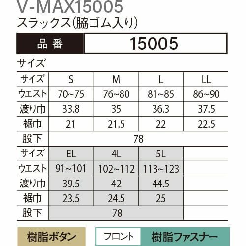 他の画像を見る 作業服 パンツ スラックス 大川被服 DAIRIKI ダイリキ V-MAX15005 スラックス(脇ゴム入り) 15005 作業着 通年 秋冬 作業ズボン 作業パンツ ワークパンツ ズボン おしゃれ かっこいい オフィス ユニホーム 作業 軽作業 外作業 工場 現場 特別価格 ¥ 4,920 税込 〜 特別価格 ¥ 税込 作業服は強くて当たり前 ハードワーカーに着用していただきたい、ユニフォーム業界で一番強い服を目指して商品化一般的な使用頻度のユーザー様には、長く着用していただけます 詳細を見る お気に入りに登録する