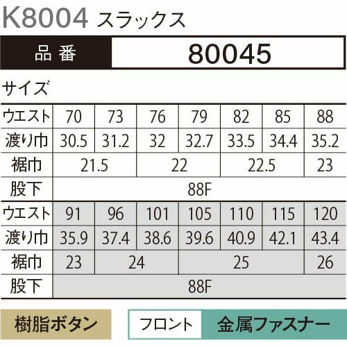 他の画像を見る 作業服 パンツ スラックス 大川被服 kansai uniform カンサイユニフォーム K8004 80045 作業着 通年 秋冬 作業ズボン 作業パンツ ワークパンツ ズボン おしゃれ かっこいい オフィス ユニホーム 作業 軽作業 外作業 工場 現場 特別価格 ¥ 5,100 税込 〜 特別価格 ¥ 税込 プロのワークシーンに元気と情熱を発信 JIS-T-8118適合(クラレトレーディング・日本製素材使用) 詳細を見る お気に入りに登録する