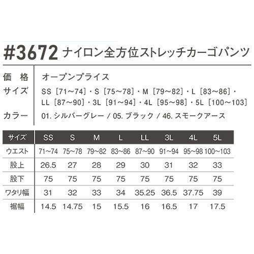 他の画像を見る アイズフロンティア カーゴパンツ ナイロン全方位ストレッチカーゴパンツ #3672 作業服 作業着 春夏 I'Z FRONTIER 軽量 ドライ ストレッチ アウトドア スポーツ ストリート スタイリッシュ 動きやすい カッコいい カジュアル 快適 特別価格 ¥ 5,049 税込 ワールドクラスのハイマテリアルを惜しげもなく使用したナイロンワークウェアの最高峰モデル ・大好評を博した#3482(ジョガーパンツ)等と同素材を使用したセットアップワークウェアのニューモデルです・アウトドア、スポーツ、ストリートカジュアルの要素を絶妙なバランスで融合したアイズフロンティアならではのデザイン性の高い1着。パンツ単体ではファン付きウェアとの相性も抜群・素材は世界トップクラスのナイロン素材メーカーデリカシー社製を採用。高品質なフルダルナイロン糸を使用することにより、ハイブランドアウトドアウェアと同等の高級感を実現。淡色シルバーグレーも抜群の抜け防止効果を発揮します。・伸長率タテ方向に約50%、ヨコ方向に約32%、伸長回復率(1時間後)タテ94%,ヨコ89%を誇る驚異のストレッチ性能を発揮。抜群の動き易さを実現します。・一般強度をクリアした薄手素材を採用し、真夏のワークシーンに快適さをプラスします。・着用時やお洗濯後のシワも少なく、手間いらずのイージーメンテナンスも大きな魅力です。・ビスロンファスナー、ドット釦等は国産YKK社製を使用。細部にまで品質に拘っています。 詳細を見る お気に入りに登録する