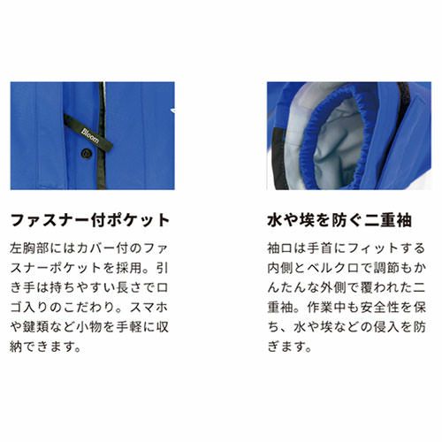 着脱できる視界追従フード、高視認な再帰性反射板、前身頃はファスナーガードのダブルラップ構造、3D立体裁断、左胸部カバー付ファスナーポケット、水やホコリを防ぐ二重袖、シームシーリング加工、腰部に大型伸縮パネル