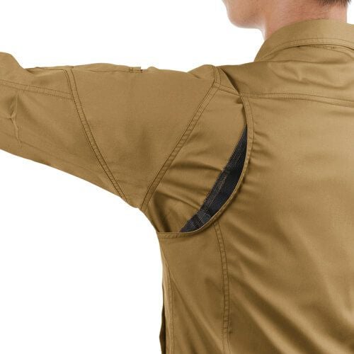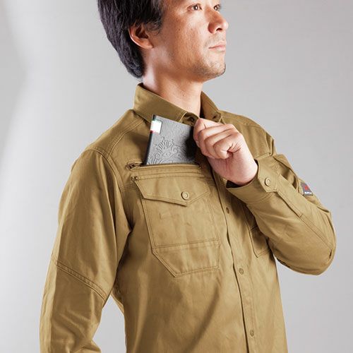 撥水性、耐久性、軽量、遮熱効果の高機能!ミリタリーテイストのフード付きベスト!! フロントの4つのフラップポケットなどミリタリーテイストのディテールを踏襲しながら、裏面にアルミコーティングを施すことで空気漏れを防止し、衣服内温度-9℃を確保するなどバートルらしいギミックに富んだファン付きウェアに仕上げている。肩にブラックの配色を施し胸ポケットのミリタリータグもさり気ないアクセントに。