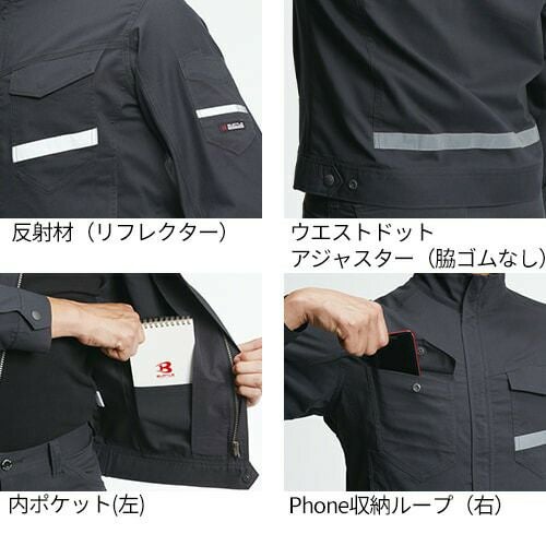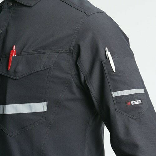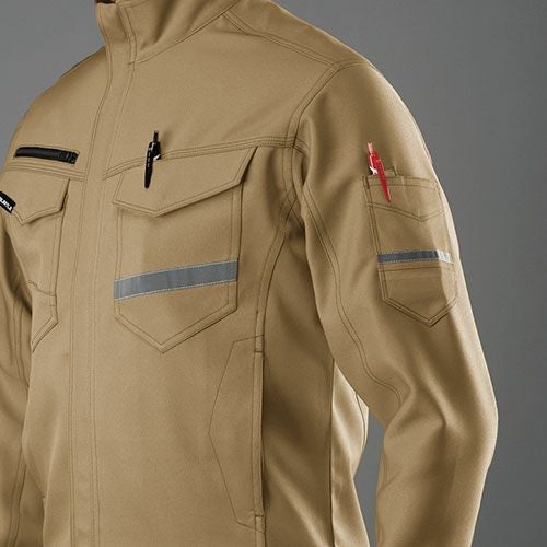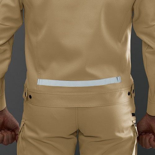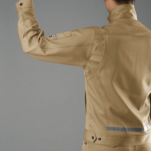 【リニューアル!!】ハードな動きに対応する快適スーパーストレッチ素材シリーズ!高視認リフレクターの装着で夜間作業にも対応!! 伸縮性に優れたスーパーストレッチ素材を使用(伸長率17%)・やや細身でスタイリッシュなレイザーシルエット・製品制電JIS T8118適合品・夜間の視認性を上げる反射材(リフレクター)を採用