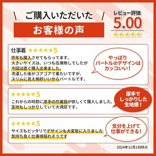 『BURTLE(バートル)』は、1958年に広島県広島市で創業した作業服メーカーで、作業着の機能性とデザイン性を高めることを追求し、業界をリードしています。特に『スタイリッシュなデザイン』・『優れた機能性』・『豊富なラインナップ』が特徴で、従来の作業着のイメージを覆すスタイリッシュなデザインが注目されています。バートルの作業着は、若い世代や建設現場以外の職場でも受け入れられ、作業着の普及に貢献しています。さらに、夏場にはファン付き作業服の「エアークラフト」、冬場には防寒着電熱ウエアの「サーモクラフト」など、一年を通して快適に仕事ができるよう新しいデバイスを開発し、進化し続けています。