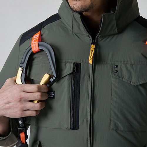 レッドファスナーが魅力!人気定番7041シリーズにデザインカラーが対応したエアークラフトシリーズ!! ★空気の漏れを防ぐ日本製高密度TCウエザークロスを採用★背ヨークに通気調整可能なエアダクトコードを装備★背面にフルハーネスランヤード装着対応仕様★定番7041シリーズとデザインカラー対応★男女ユニセックスシリーズ