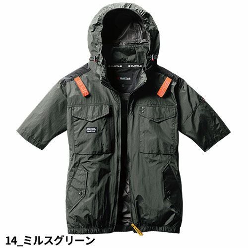 撥水性、耐久性、軽量、遮熱効果の高機能!ミリタリーテイストのフード付き半袖ブルゾン!! フロントの4つのフラップポケットなどミリタリーテイストのディテールを踏襲しながら、裏面にアルミコーティングを施すことで空気漏れを防止し、衣服内温度-9℃を確保するなどバートルらしいギミックに富んだファン付きウェアに仕上げている。肩にブラックの配色を施し胸ポケットのミリタリータグもさり気ないアクセントに。