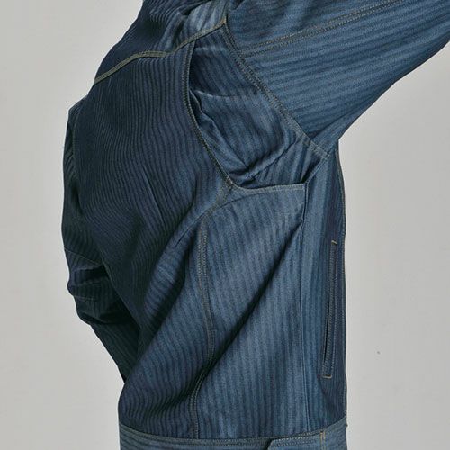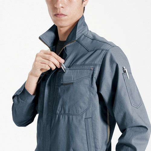 鉄工などハードな現場で実力発揮!強さと快適さで選ぶなら綿100% 高品質な日本製チノクロス素材を使用製品シリコン洗い加工によるソフトな着用感と防縮性衿まわりに蓄熱保温素材を採用