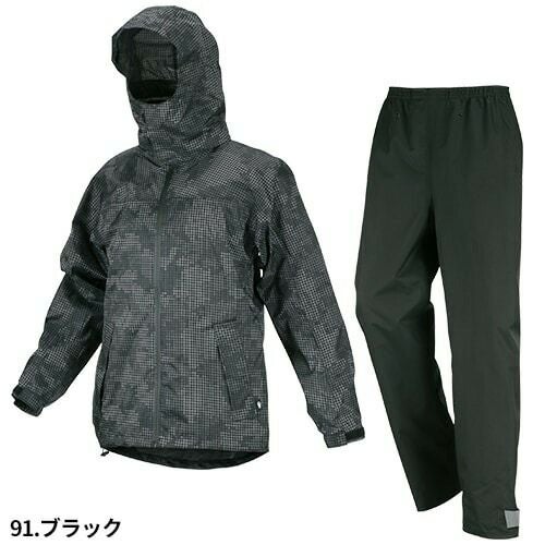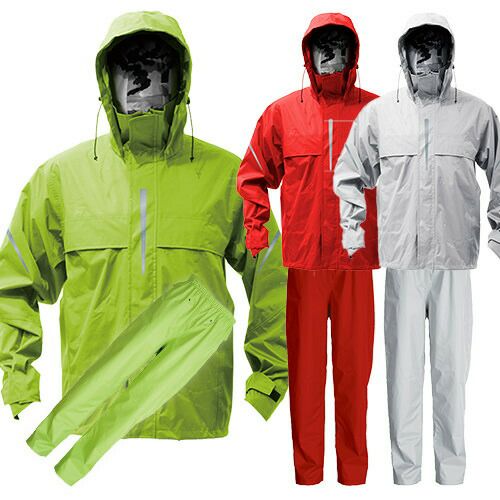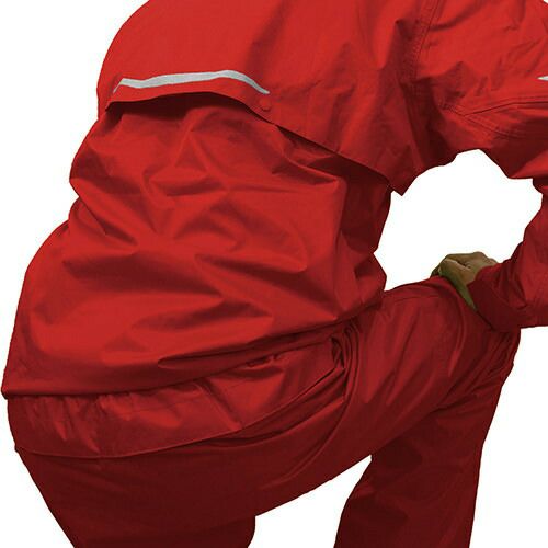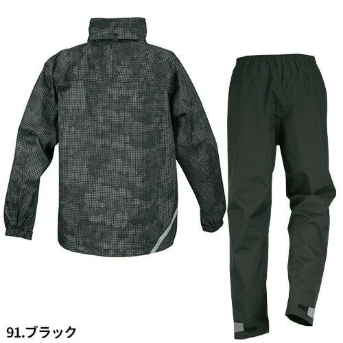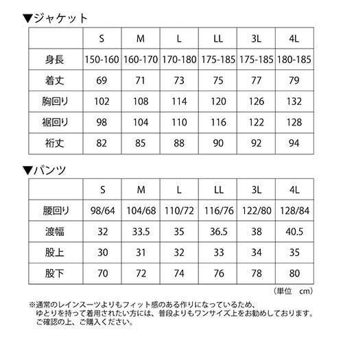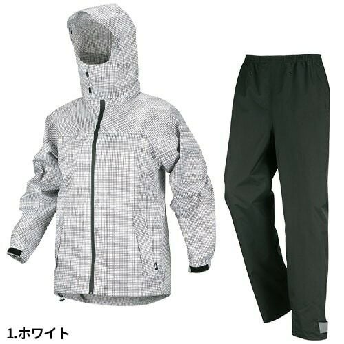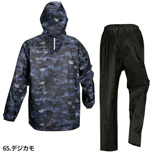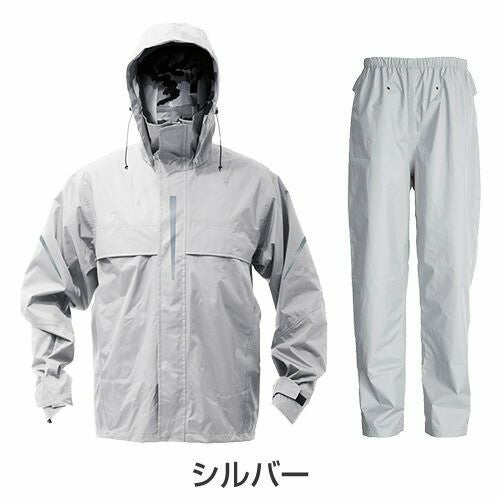 視認性の高い作業用レインスーツ 胸・背中・腕・膝・裾に再帰反射テープを装備し、夜間の安全性を確保リフレクターは360度どの角度からも視認性を確保ダブル前立て右脇ポケットウエストスピンドルパンツ通気口背面ベンチレーションクリアケース:社名や名前などを挟み入れることができる取り外し可能なクリアケースフード:雨から視界を確保し、安全性を高めるクリアメガネ付きヘルメット対応フード。フード高さ調節機能付き裾幅調節:裾のファスナー(三角マチ)により、靴を履いたまま着脱が可能・実用新案登録済みかかと補強:摩擦に強い生地を使用し、地面擦れやすいかかと部分を補強