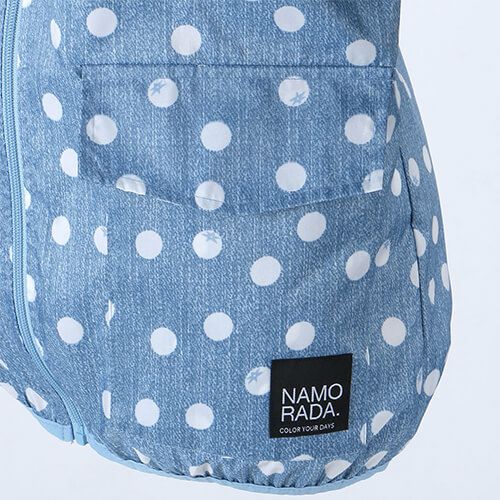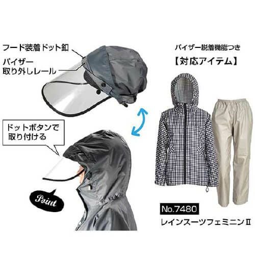 ドットボタンで取り付けられるゴム+調整機能 ぴったりフィット バイザーシステムが搭載されたレインウェアのフードに直接ドットボタンで取り付ける事が可能ですフードを被った時の視界を守り、雨によるメイク崩れも防ぎますUV加工で晴れの日の紫外線防止にも