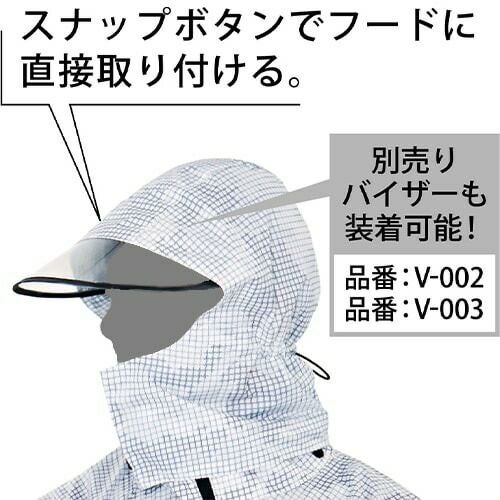 首の動きに合わせてフードがまわる 特許取得のローリングレール搭載でフードが首の動きに合わせてまわります。また、スナップボタンでフードに別売りバイザー(V-002、V-003)を取り付けることができます。