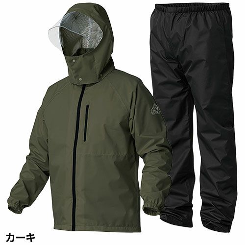 ・上着は、着脱可能な透明バイザー付大型立体フード(ヘルメット対応)、左胸に止水ファスナー付ポケット、背面腰部分と左腕に反射プリント、かがんでも背中が出にくいサイクルカット仕様と機能満載