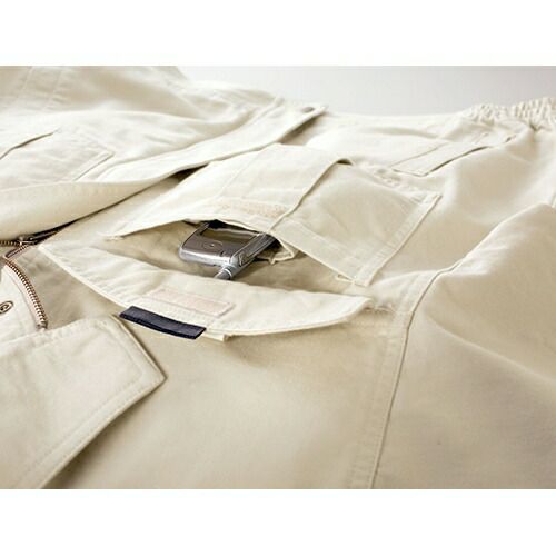 製品洗い加工を施した風合いのある超ストレッチデニムとなっています。伸縮性のあるストレッチ素材を使用しており、ジャンパーの袖内側・パンツの内股ギャザーで抜群の動き易さを実現していますので、激しい現場作業でも邪魔になりません。左袖にはマルチポケットがありますので、現場道具などを持ち歩くのにも大変便利となっています。