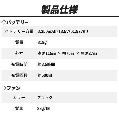 20Vで秒速106Lの特大風量が実現 ■ファン(風量、連続稼働時間)弱:56L/s・約20時間、中:78L/s、約8.5時間、強:95L/s、約5時間、最強:106L/s、約8時間ファン質量(1個):88g■バッテリー出力弱:10V、中:14V、強:17V、最強:20V■充電式リチウムイオン電池(DC18.5V/3350mAh/61.97Wh)重量:約319g外形寸法:W75×D27×H115mm充電時間:約3.5時間充電回数:約500回定格入力:DC21V/1500mA